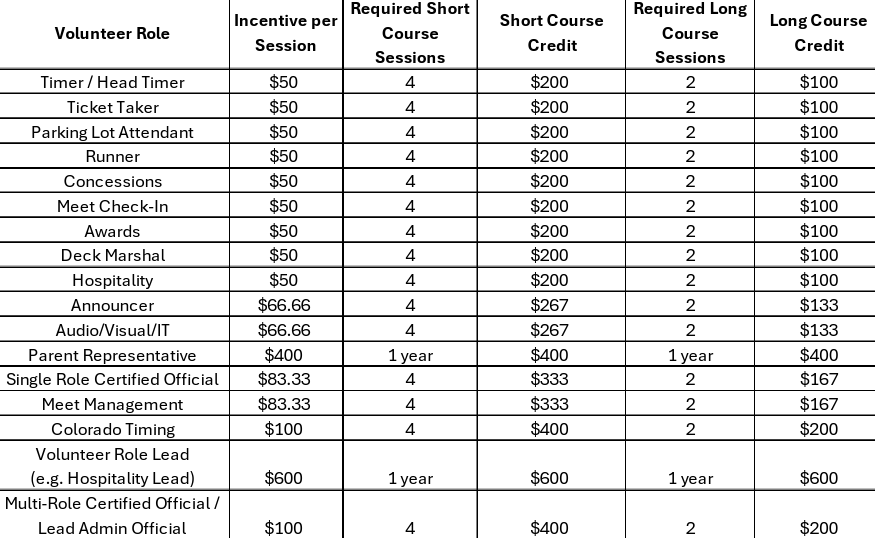 Roles include mer, concessions, awards, deck marshal, announcer, IT/AV, hospitality, meet management, cer fied officials, and more. Not every role is available at every meet.